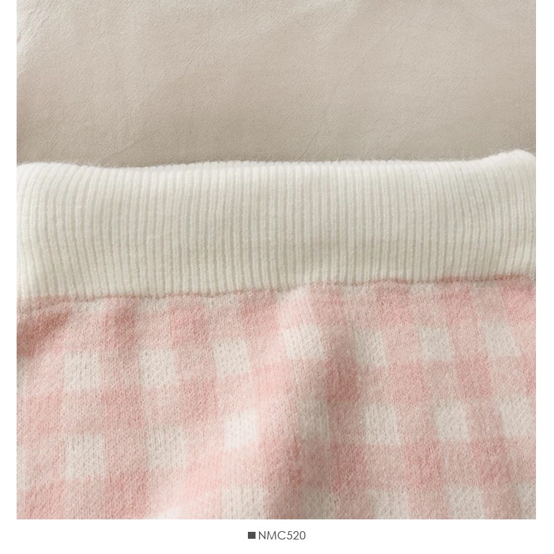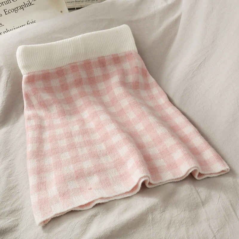 FREE SHIPPING: Pink Sweet Plaid Three-Piece Long-Sleeved Loose Sweater with Short Strap + Skirt