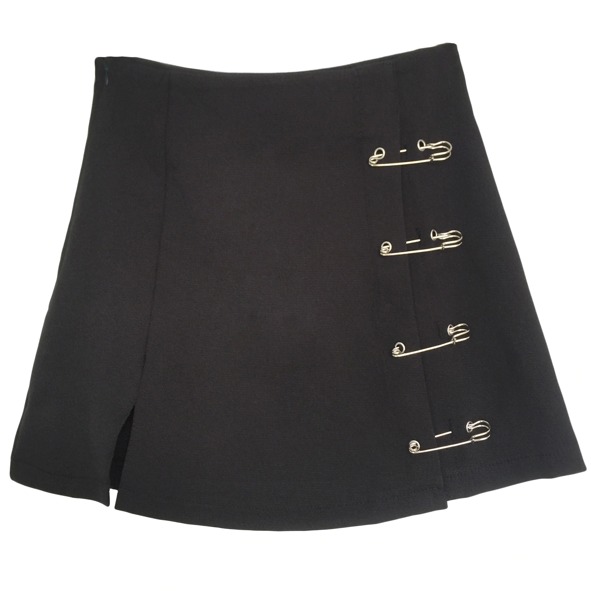 A mini skirt in cotton blend fabric that featuring with side slit and oversized safety pin detailing.