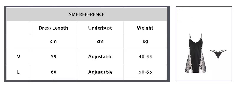 Material: Polyester" Colour: Black, White" Size M, L The package includes a night dress and thong only.