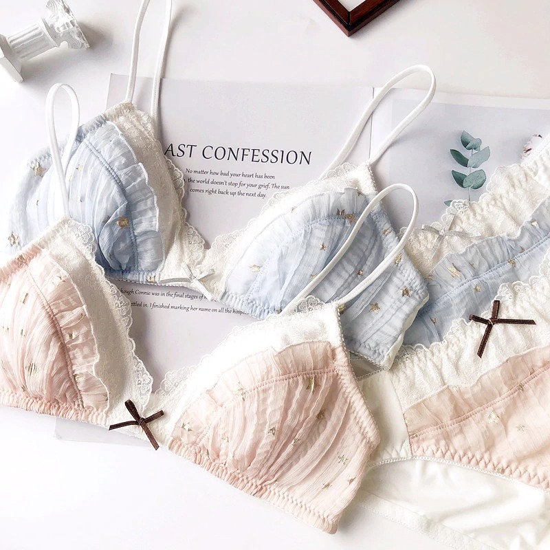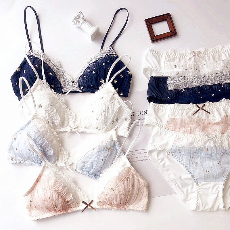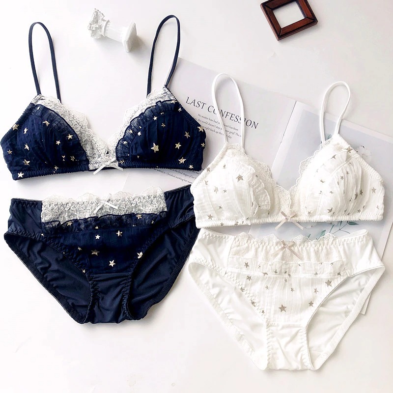 FREE SHIPPING: Japanese Lolita Glitter Star Lace Side Brassiere Sexy Bra And Panty Lingerie Set