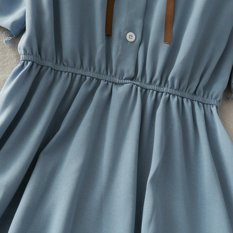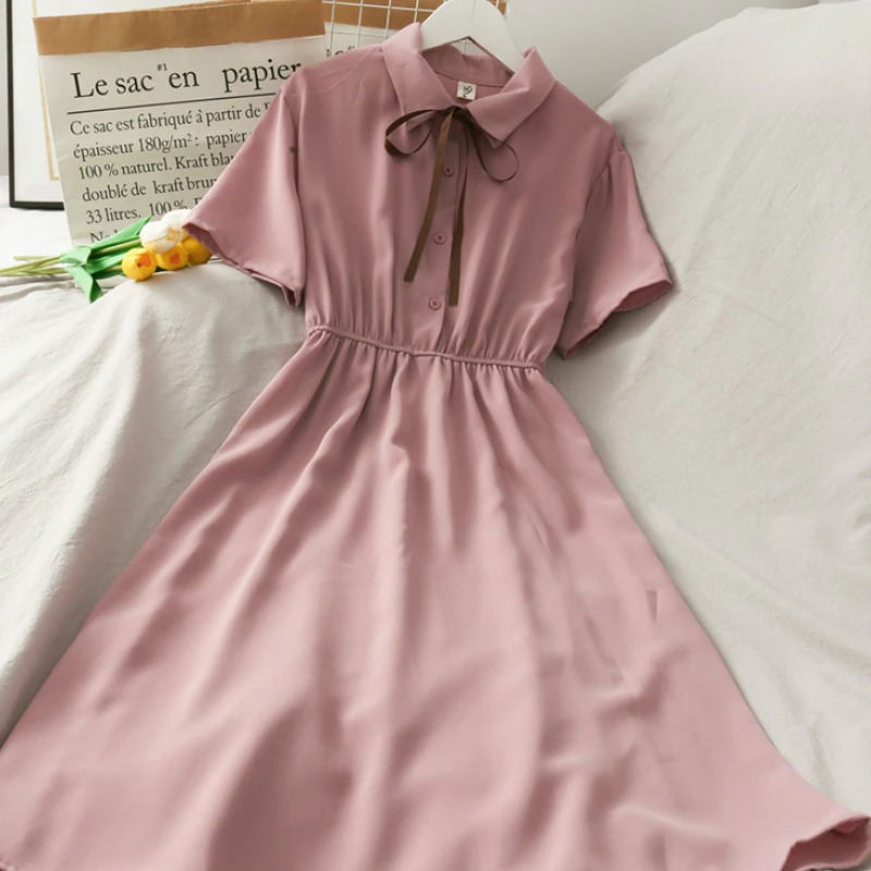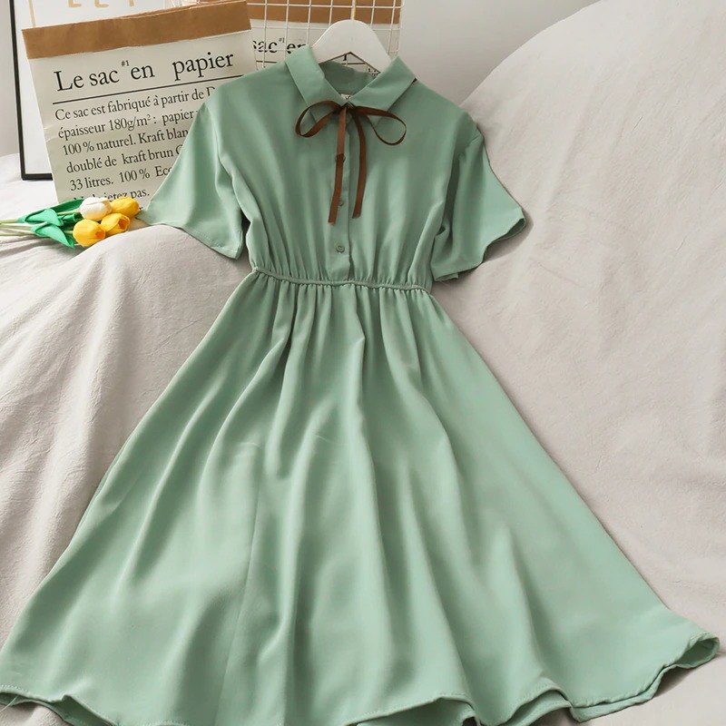 FREE SHIPPING: Chiffon Bow Solid High Waist Turn-down Collar Preppy Style Kawaii Ulzzang Dress