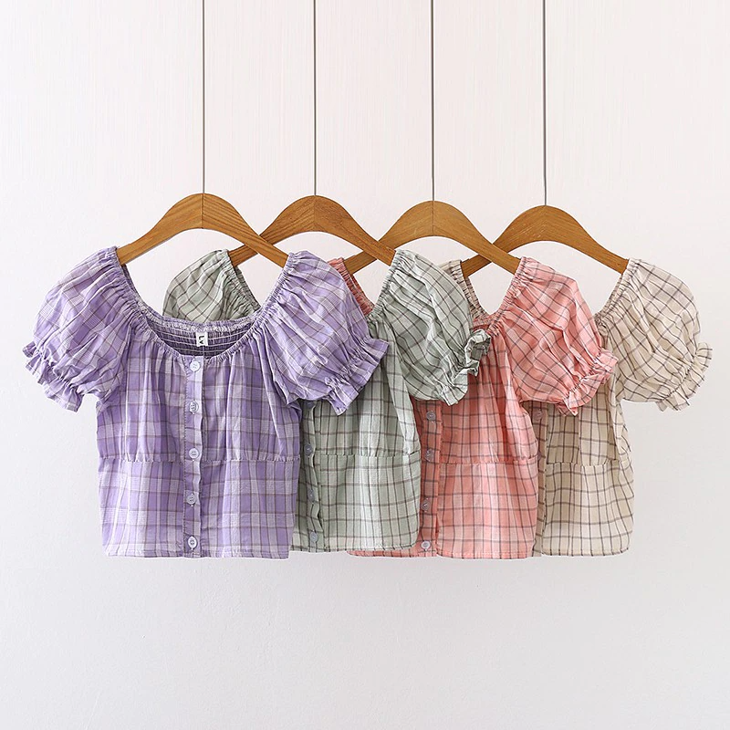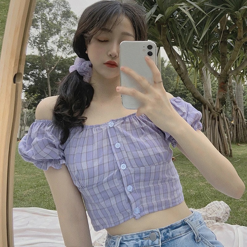 FREE SHIPPING: Cute Plaid Print Off Shoulder Blouse Crop Top