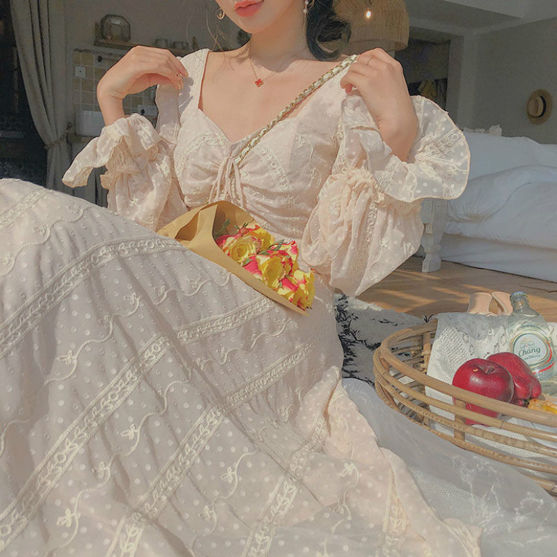 FREE SHIPPING: French Vintage Puff Sleeve Lace Floral Casual Dress